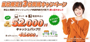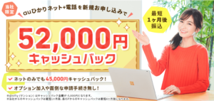 - ネット+電話申し込みで52,000円キャッシュバック。