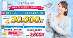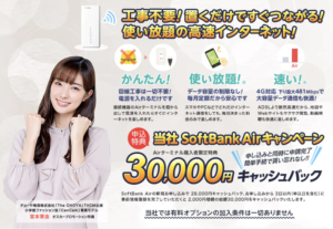 今なら、SoftBank Airを「新規」でお申し込みの方は、30,000円キャッシュバック!!