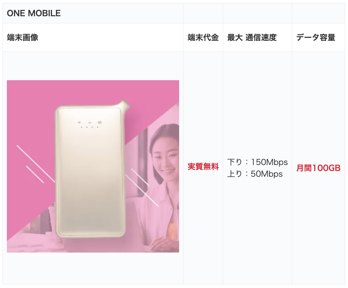 ONE MOBILEは、クラウドSIM技術を活用したポケット型WiFi。日本の3大キャリア回線を使用可能なため、どこでも快適にインターネットに接続できます。 月間100GBの大容量データを提供し、このWiFi革命セットにより、これまでにないコストパフォーマンスを実現しています。移動中も、家でも、ONE MOBILEがあれば、安心して大容量データを使いこなせます。口コミ