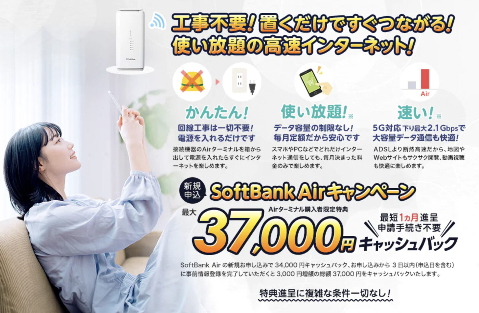 37,000円キャッシュバック! 工事は不要で、つかい放題!! 4G対応、下り回線481Mbpsだから、速くて快適!! 手続きはカンタン。さらに、